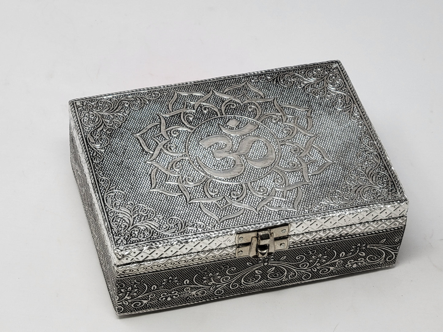 Unlock the power of the universe with our Metal Box - Om w/Velvet liner. Made from durable metal, this box features the sacred Om symbol and a soft velvet liner. Keep your treasures safe and imbue them with positive energy.
