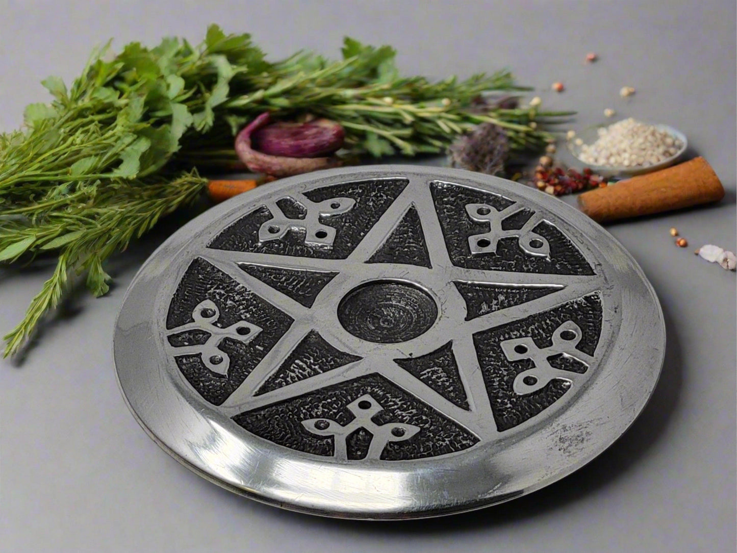 Experience the power of the Pentacle with our metal incense burner! Perfect for your altar, this tile features the five pointed star within a circle, representing the elements and the divine. Made of sturdy metal, it adds a touch of magic to your incense burning ritual.
