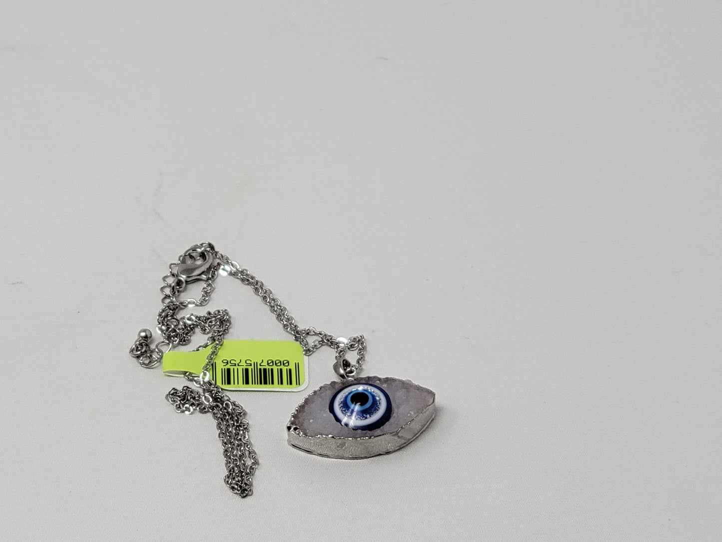 "Protect yourself from negative energy with our Silver Evil Eye in Druz. This stunning dark blue pendant wards off bad vibes and brings good luck. Made with genuine sterling silver and natural Druz stone, it's a must-have accessory for any jewelry collection."